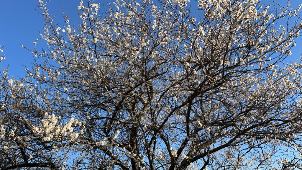 ふと見上げると、枝いっぱいに白い花が咲いていました。