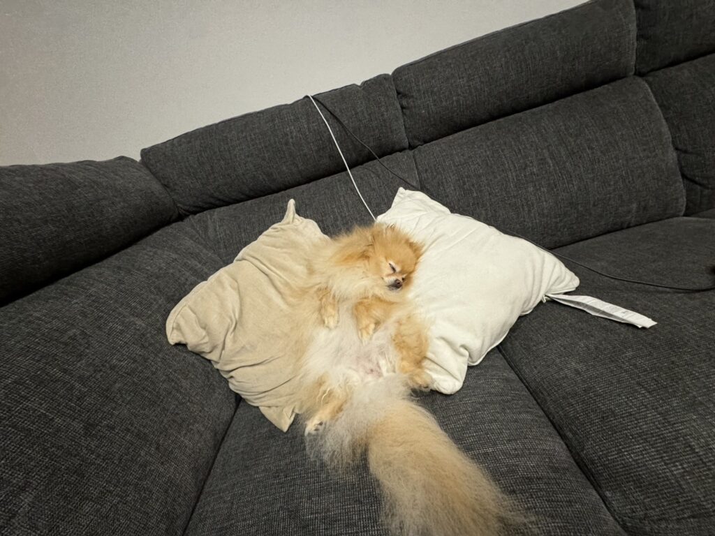ソファでくつろいでいたら、うちの子もちゃっかりクッションを独占してスヤスヤ…🐶💤
